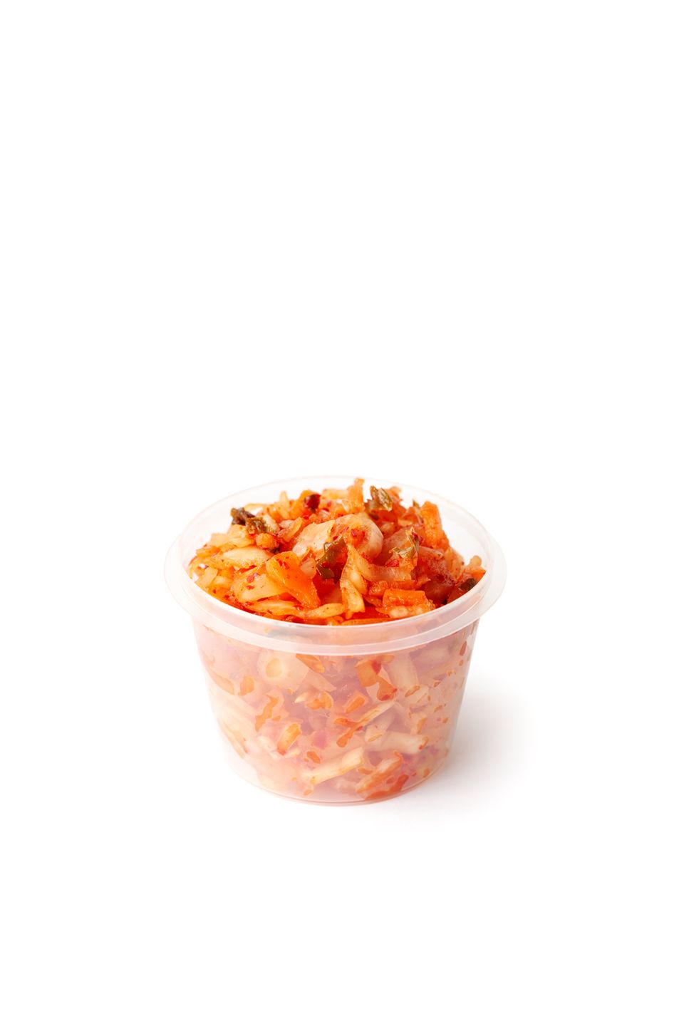 Good-for-your-gut kimchi with fermented white cabbage, carrots, spring onions and apples with hints of chilli, garlic, and ginger.