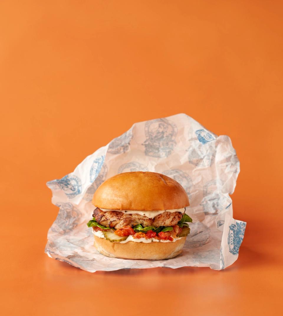 Chargrilled chicken thigh with tarragon mayonnaise. Served in our sourdough burger bun with fresh tomato relish.