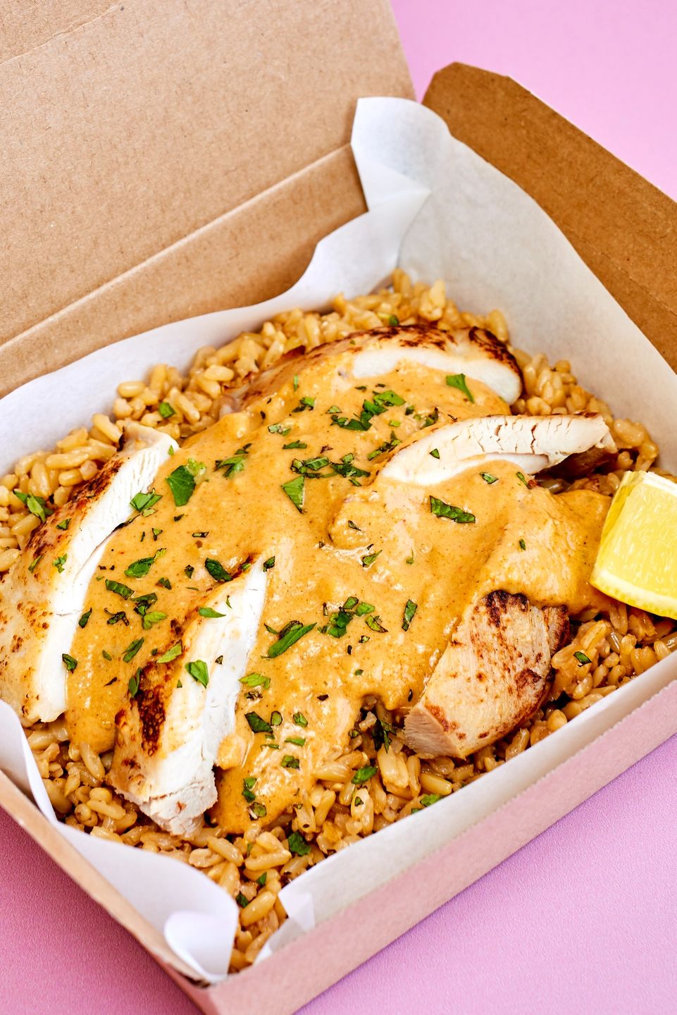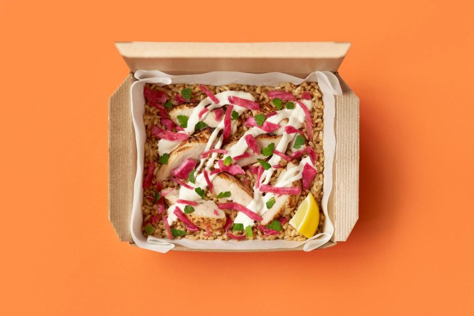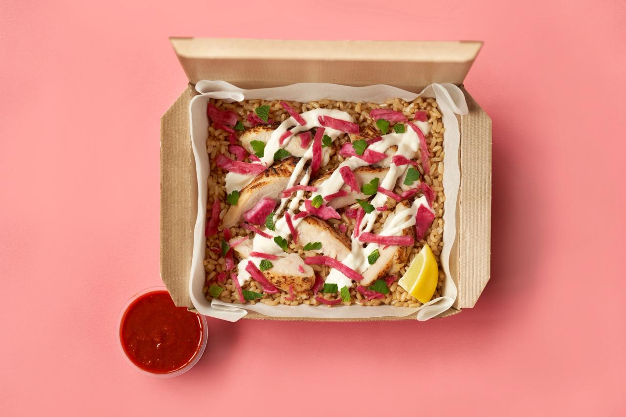 It's the LEON staple, with a kick. Chargrilled chicken thigh with creamy LEON Aioli, smoky pink kraut, fresh herbs, and a lemon for squeezing. Served on brown rice.