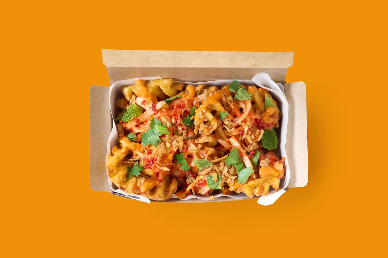 Join the kimchi craze with these spicy 'n' saucy loaded fries. LEON Baked Fries topped with Korean Mayo, kickin' kimchi, crispy onions, and fresh herbs.