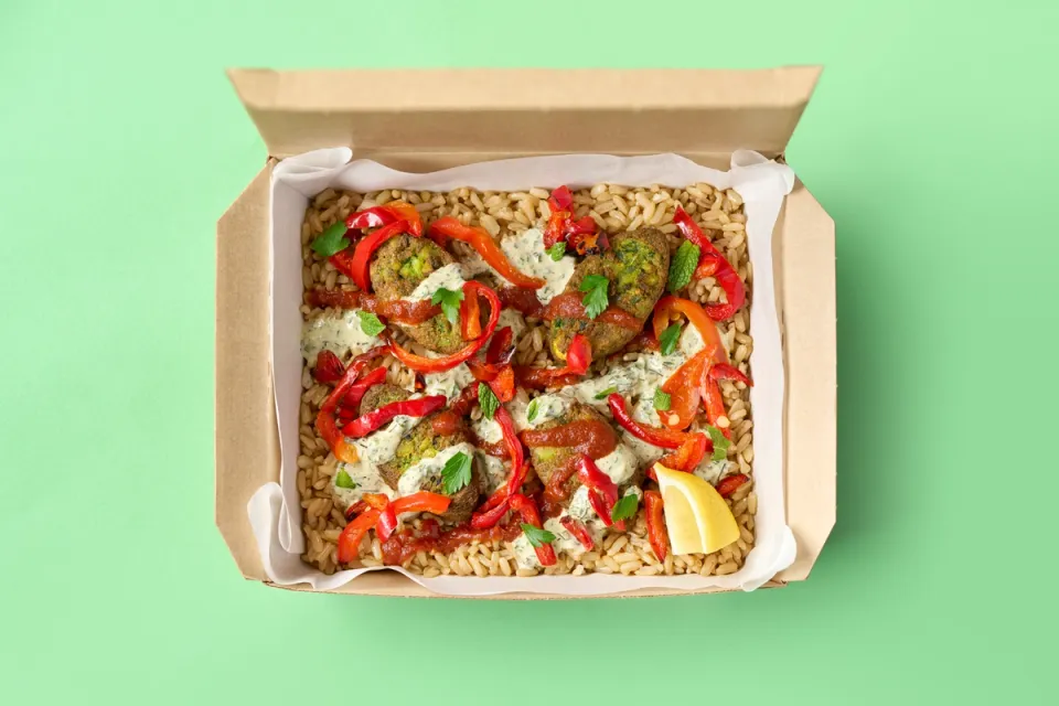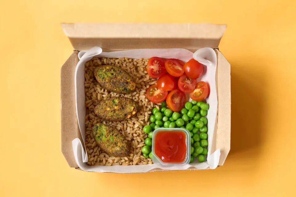 A plant-packed veggie treat for little ones. Falafel served with cherry tomatoes, peas, brown rice, and ketchup.