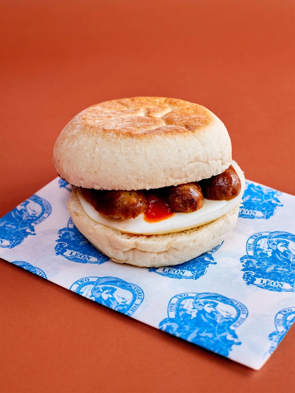 British Cumberland sausage, egg and LEON-made ketchup in a lightly toasted sourdough muffin