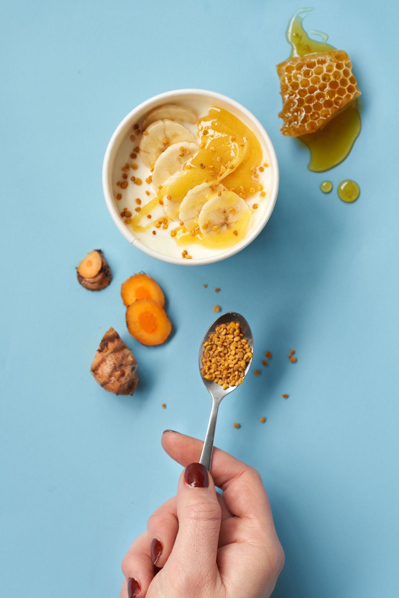 The anti-inflammatory pot. Turmeric honey & sliced banana with live yoghurt. Topped with bee pollen.