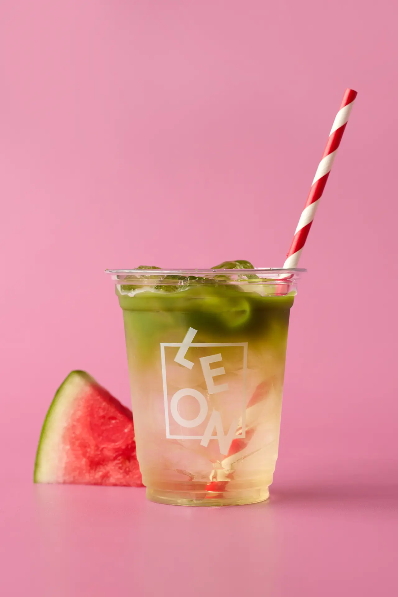 Sweet watermelon green tea, topped with vibrant matcha and served over ice. Oh-so-cool.