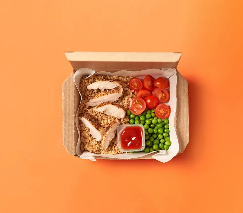Chargrilled chicken thigh pieces on LEON brown rice, served with peas, cherry tomatoes and a pot of ketchup. A balanced meal to keep those little ones fuelled.