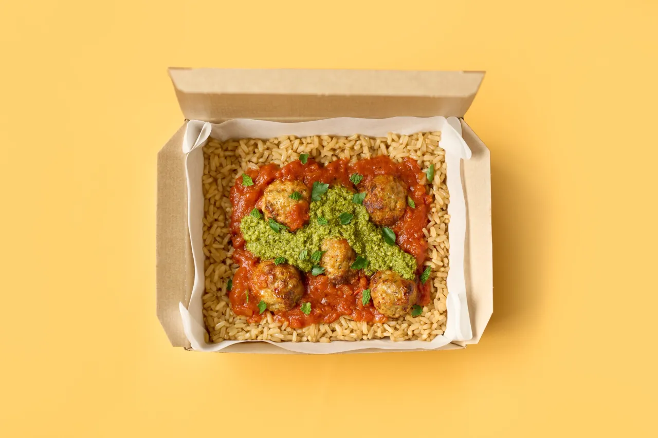 Inspired by the flavours of Sicily, our chicken meatballs are made with Italian cheese, capers, and fennel seeds, served with LEON tomato sauce, a dollop of basil pesto, and brown rice. Grab life by the meatballs.
