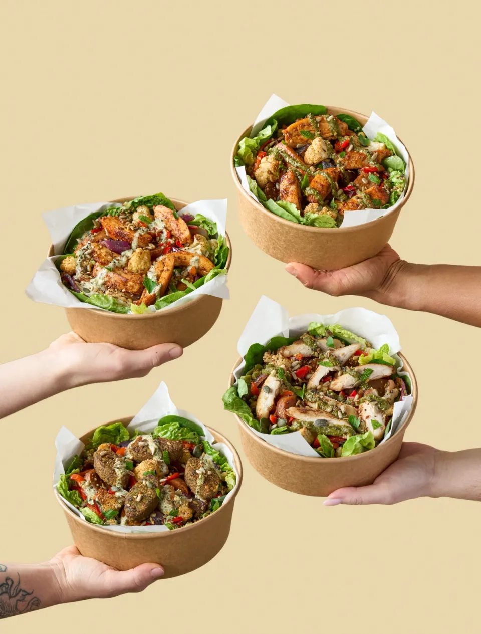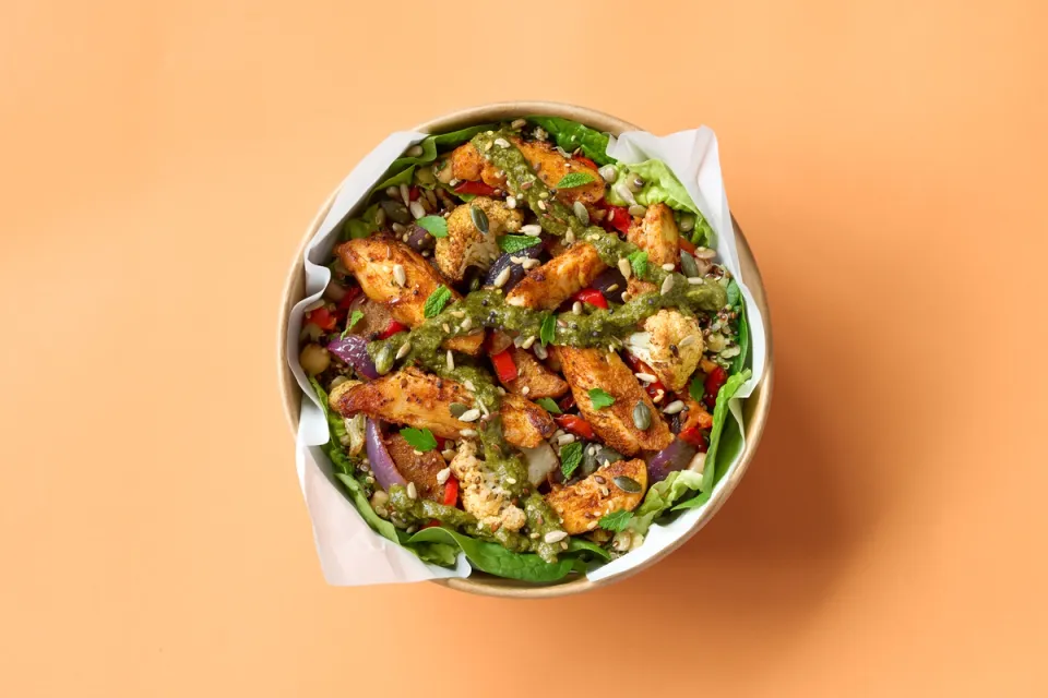 Build your own Super Bowl. Start with a superbase of fresh greens, Middle Eastern spiced roasted veggies, grains, beans, seeds, and herbs. Then pick your protein and your flavour profile. Your bowl, your way.