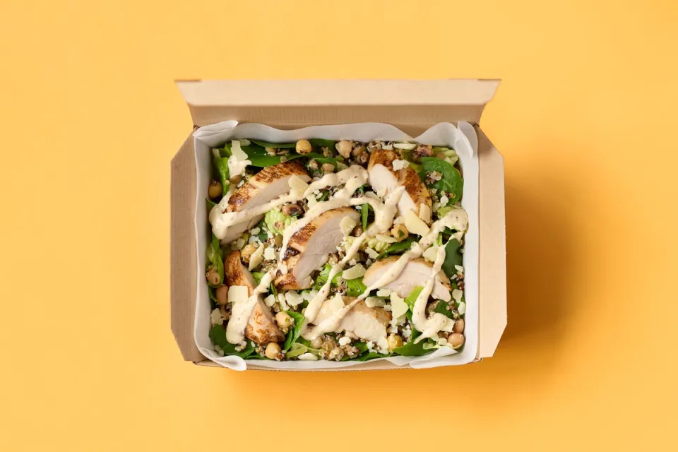 Crisp leaf salad, chargrilled chicken, Grana Padano, and hearty grains & seeds - all topped with our Honey Mustard Caesar Dressing. Classic Caesar, LEON style.