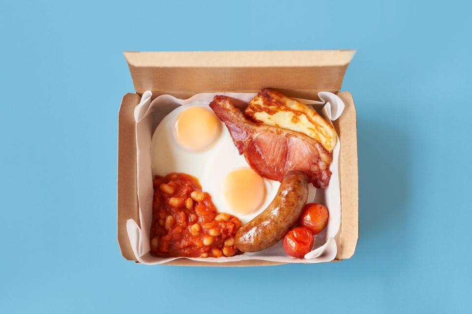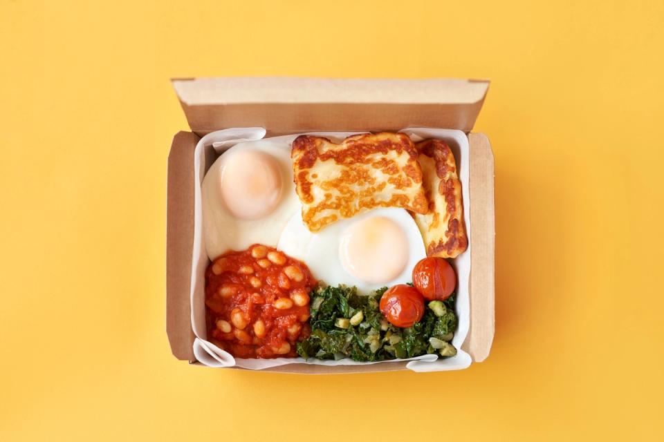Hallou, is it breakfast you’re looking for? This box is packed with grilled halloumi, two freshly poached eggs, supergreens shakshuka, and saucy beans. The breakfast of champions.