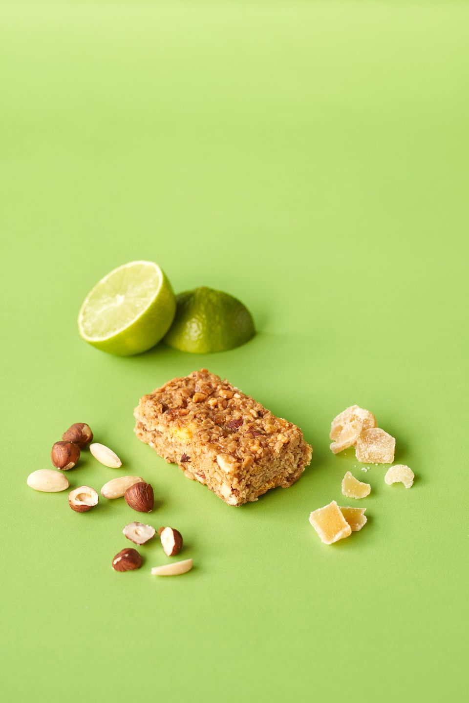 Gluten-free oats, nibbed hazelnuts and nibbed almonds blended with golden syrup, lime juice, lime zest and crystallised ginger. Not your ordinary flapjack.