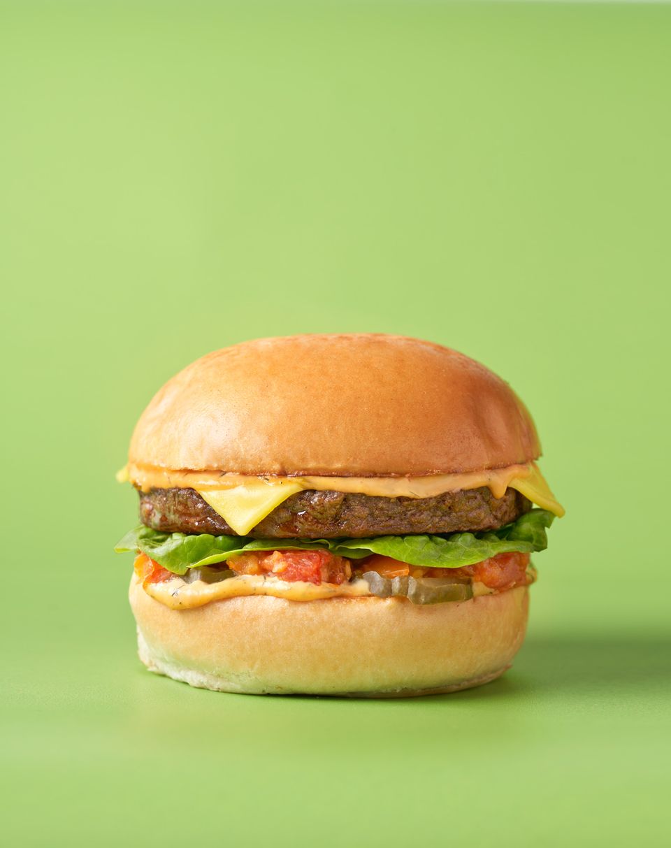 What the world needs now. A vegan burger topped with our LOVe Burger sauce, fresh tomato relish, crunchy lettuce, pickles and a slice of mature cheddar vegan cheeze.