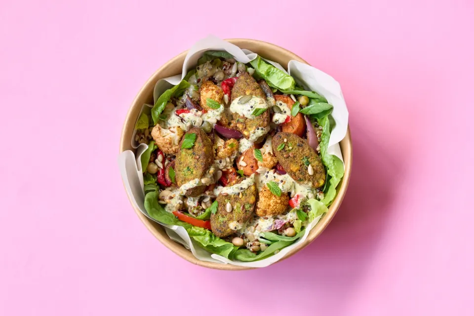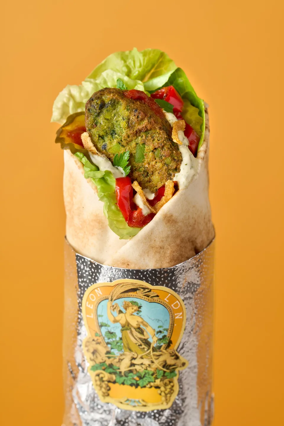 Herb your enthusiasm, 'cos our falafel is packed with greens. Paired with creamy Golden Goddess sauce, LEON Chilli Sauce, fresh herbs, crispy onions, roasted peppers, and pickles. Bold, fresh, and full of plants.