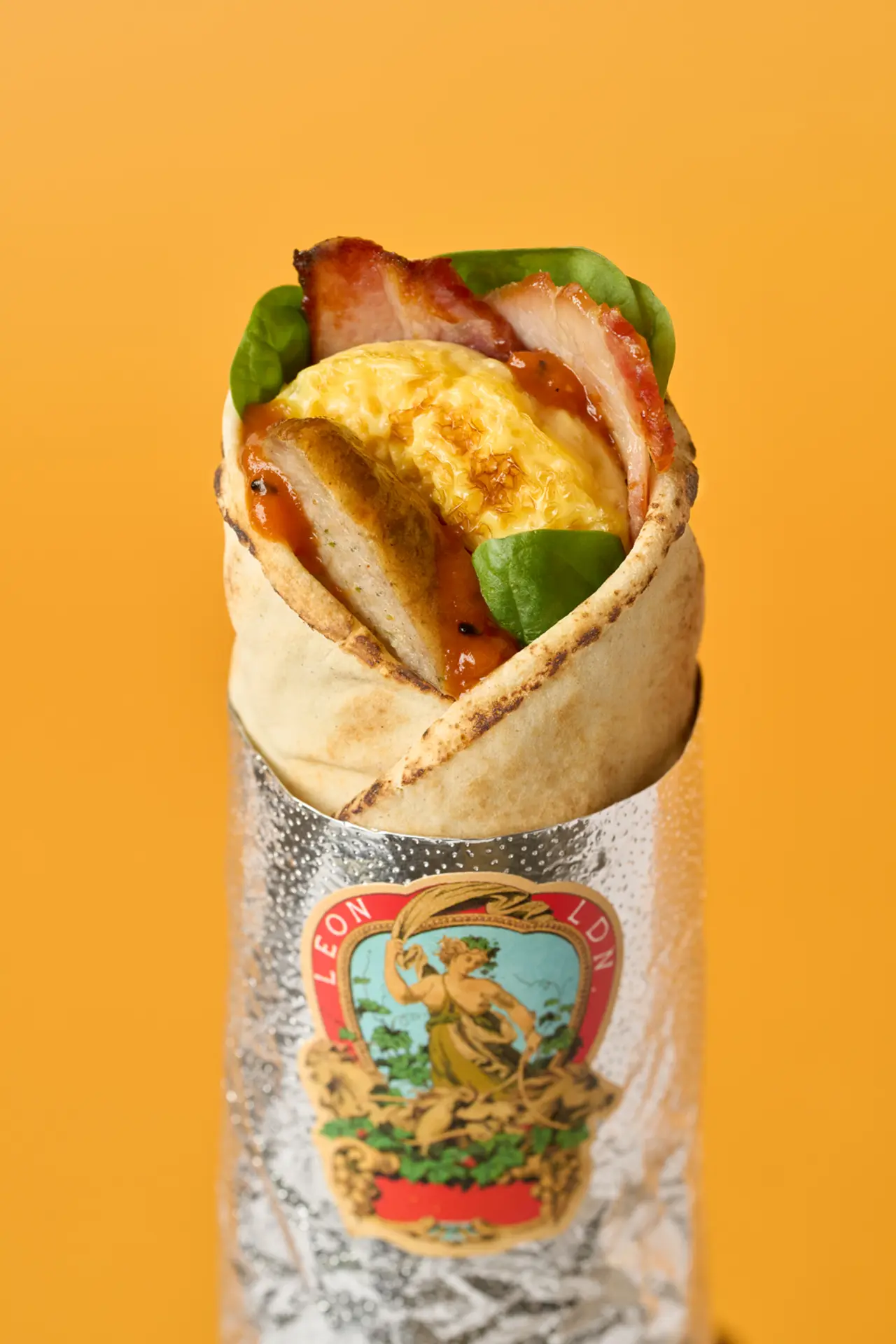 This wrap's packing some serious sausage, along with bacon, free range egg omelette, spinach, and LEON Ketchup. It's your Full English, wrapped up and ready to eat on the go.