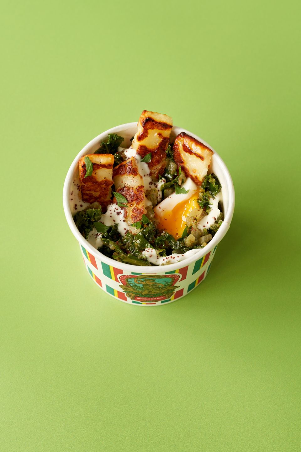Freshly poached free-range egg with a cumin-spiced supergreens shakshuka - kale, green chilli, spinach, and courgette - topped with grilled halloumi cheese, LEON Aioli and fresh herbs.