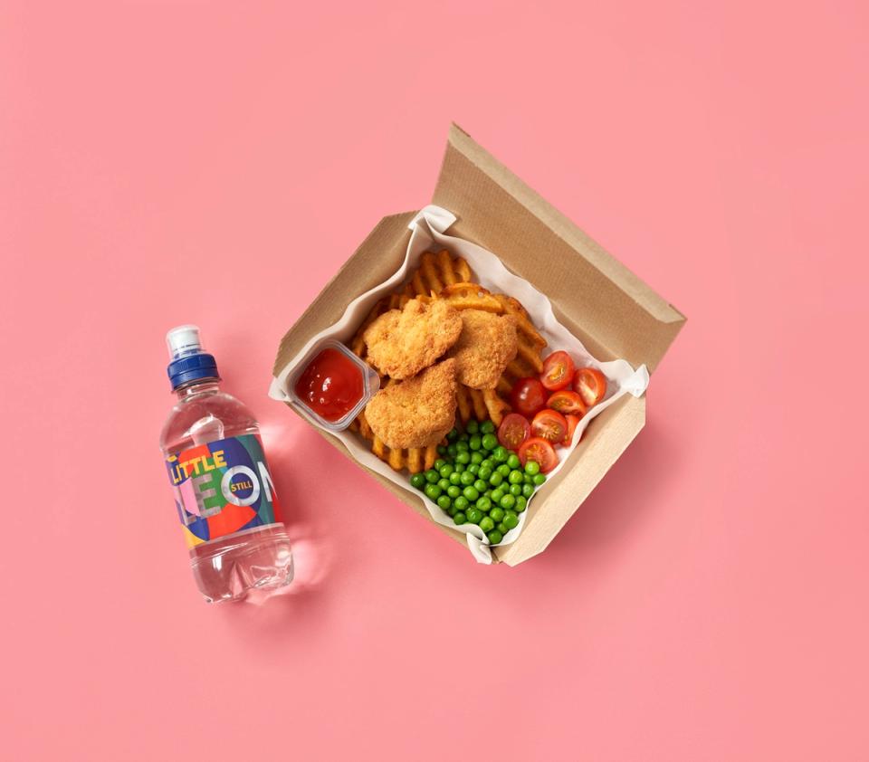Gluten-free chicken thigh nuggets served with LEON baked fries, cherry tomatoes and fresh peas
