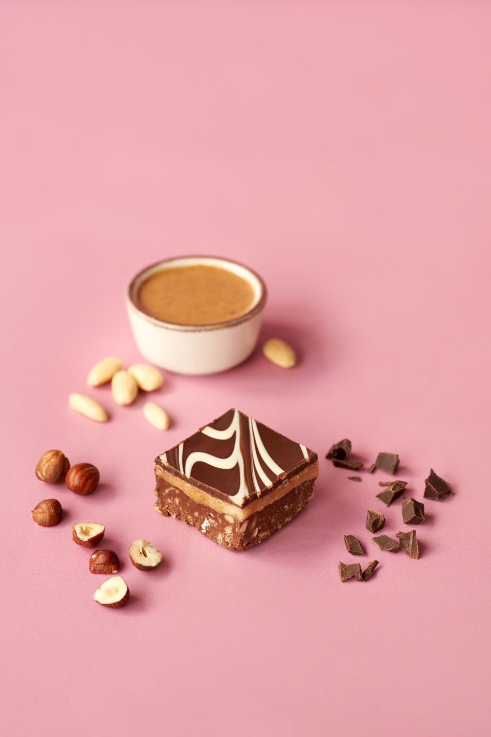 An oaty nutty biscuit base, bound together with golden syrup. Topped with a layer of nutty almond butter and finished with marbled dark & white chocolate.